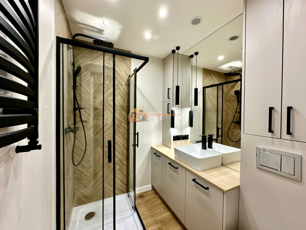 - Łazienka z WC wyposażona w kabinę prysznicową oraz meblami wykonanymi na wymiar z miejscem na pralkę + suszarkę.
