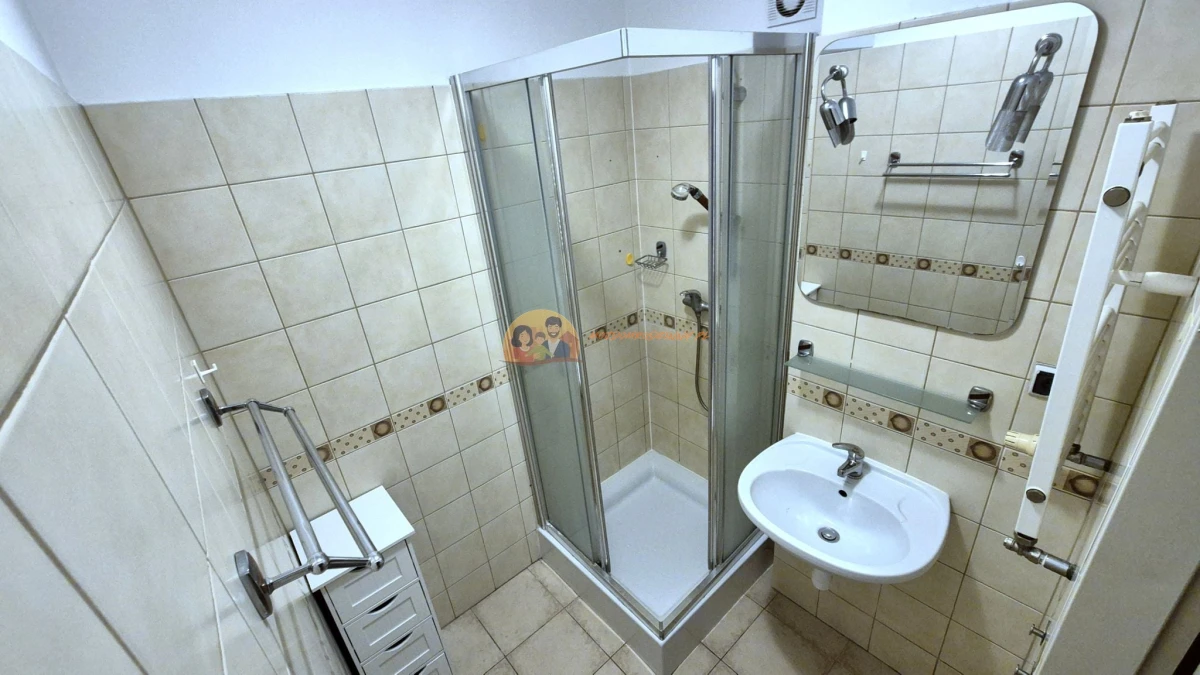 ŁAZIENKA: Kabina prysznicowa, pralka, miejsce na suszarkę.